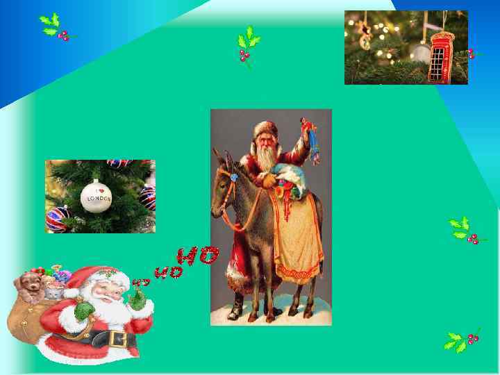 • По преданиям, Санта Клаус передвигается по Англии на маленьком ослике, поэтому, укладываясь спать в новогоднюю ночь, ребятишки готовят угощение не только для главного зимнего волшебника, но и для его друга. В деревянные башмаки они кладут сено и оставляют их на столе рядом с тарелкой для подарков.