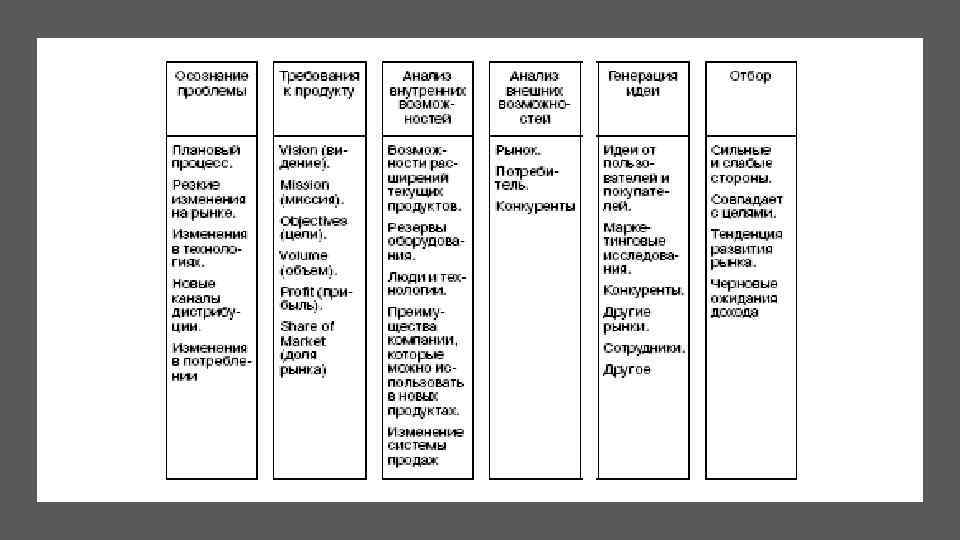Процесс создания нового товара. Отбор Если на предприятии или в отделе правильно организован процесс создания новых идей, на первое место выходит проблема отбора наиболее жизнеспособных из них. Конечно, никто заранее не может знать, какое из 30 полученных на предыдущем этапе озарений окажется наиболее продуктивным в будущем. Однако для того, чтобы расставлять приоритеты и не тратить ограниченные ресурсы на развитие всех понравившихся мыслей, нужно как-то определить, на какую лошадку ставить. С нашей точки зрения главных критериев обзора всего три: слабые стороны идеи, совпадение ее с поставленными перед компанией и новым товаром целями, соответствие тенденциям развития рынка.