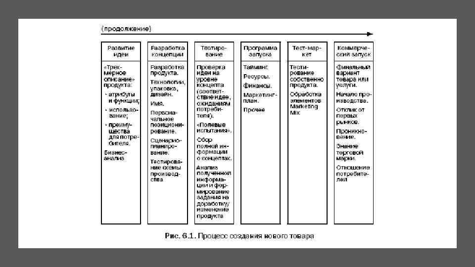 Процесс создания нового товара. Тестмаркет Тест-маркет. Один из немногих этапов, которые на наших рынках можно не проводить. Хотя, если у вас достаточно денег и времени, и вы не боитесь, что о ваших идеях узнают конкуренты, не стоит его игнорировать. В идеале этот этап предполагает ограниченную продажу готового (!) товара на выбранных локальных рынках. Такие эксперименты часто проводят американские компании: там большое количество штатов, в которых можно экспериментировать. Американцы справедливо считают, что лучше потратить миллионы долларов на создание продукта, доставку его в магазины и ограниченную рекламу на выбранной территории, чем сотни миллионов при работе сразу на всю страну.