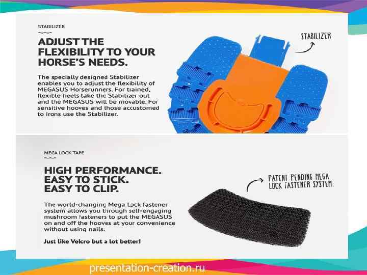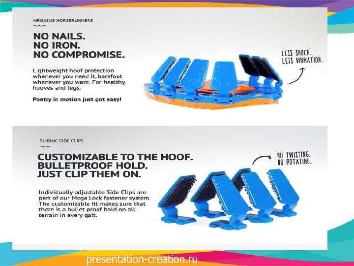 Megasus Horserunners крепится к копыту при помощи специальной запатентованной системы. Если простыми словами, то на копыта наклеивается липучка, к которой специальными ушками зацепляется сама «подкова» .