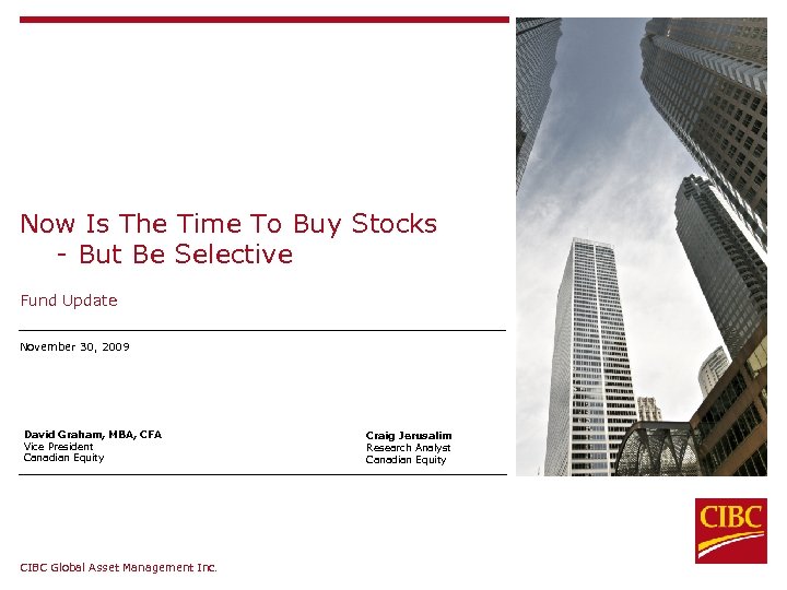 Now Is The Time To Buy Stocks - But Be Selective Fund Update November 30, 2009 David Graham, MBA, CFA Vice President Canadian Equity CIBC Global Asset Management Inc. Craig Jerusalim Research Analyst Canadian Equity