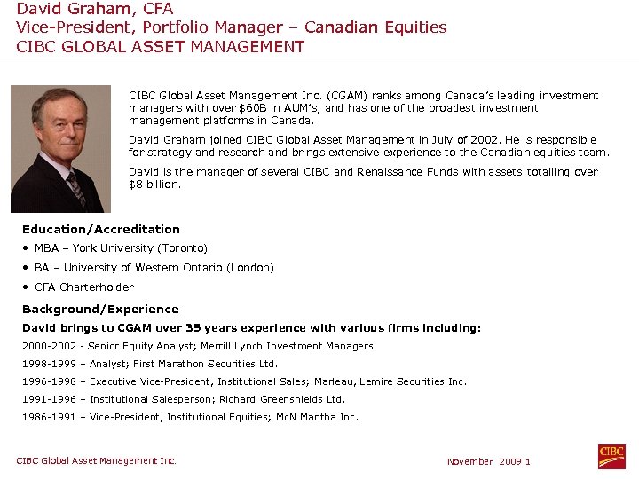 David Graham, CFA Vice-President, Portfolio Manager – Canadian Equities CIBC GLOBAL ASSET MANAGEMENT CIBC Global Asset Management Inc. (CGAM) ranks among Canada’s leading investment managers with over $60 B in AUM’s, and has one of the broadest investment management platforms in Canada. David Graham joined CIBC Global Asset Management in July of 2002. He is responsible for strategy and research and brings extensive experience to the Canadian equities team. David is the manager of several CIBC and Renaissance Funds with assets totalling over $8 billion. Education/Accreditation • MBA – York University (Toronto) • BA – University of Western Ontario (London) • CFA Charterholder Background/Experience David brings to CGAM over 35 years experience with various firms including: 2000 -2002 - Senior Equity Analyst; Merrill Lynch Investment Managers 1998 -1999 – Analyst; First Marathon Securities Ltd. 1996 -1998 – Executive Vice-President, Institutional Sales; Marleau, Lemire Securities Inc. 1991 -1996 – Institutional Salesperson; Richard Greenshields Ltd. 1986 -1991 – Vice-President, Institutional Equities; Mc. N Mantha Inc. CIBC Global Asset Management Inc. November 2009 1
