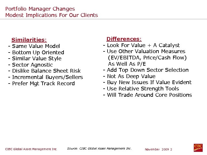 Portfolio Manager Changes Modest Implications For Our Clients Similarities: - Same Value Model - Bottom Up Oriented - Similar Value Style - Sector Agnostic - Dislike Balance Sheet Risk - Incremental Buyers/Sellers - Prefer Mgt Track Record CIBC Global Asset Management Inc. Differences: - Look For Value + A Catalyst - Use Other Valuation Measures (EV/EBITDA, Price/Cash Flow) As Well As P/E - Add Top Down Sector Selection - Not As Deep Value - Buy New Issues If Value Evident - Use Relative Strength Tools - Will Trade Around Core Positions Source: CIBC Global Asset Management Inc. November 2009 2