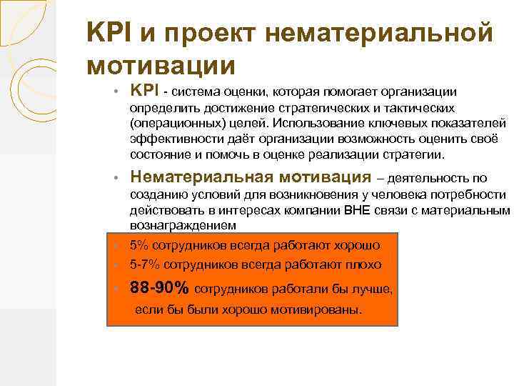 KPI и проект нематериальной мотивации • KPI - система оценки, которая помогает организации определить достижение стратегических и тактических (операционных) целей. Использование ключевых показателей эффективности даёт организации возможность оценить своё состояние и помочь в оценке реализации стратегии. • Нематериальная мотивация – деятельность по созданию условий для возникновения у человека потребности действовать в интересах компании ВНЕ связи с материальным вознаграждением • 5% сотрудников всегда работают хорошо • 5 -7% сотрудников всегда работают плохо • 88 -90% сотрудников работали бы лучше, если бы были хорошо мотивированы.