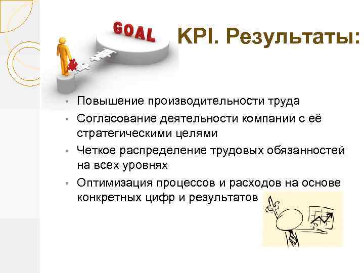 KPI. Результаты: Повышение производительности труда • Согласование деятельности компании с её стратегическими целями • Четкое распределение трудовых обязанностей на всех уровнях • Оптимизация процессов и расходов на основе конкретных цифр и результатов. •