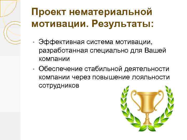 Проект нематериальной мотивации. Результаты: Эффективная система мотивации, разработанная специально для Вашей компании • Обеспечение стабильной деятельности компании через повышение лояльности сотрудников •