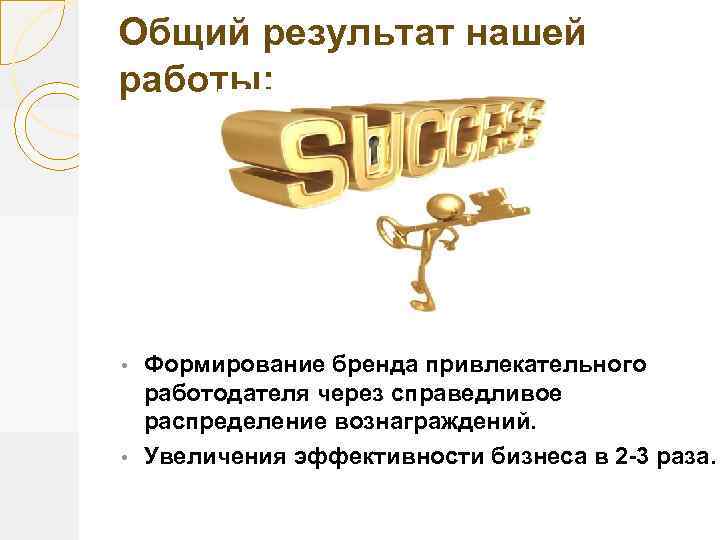 Общий результат нашей работы: Формирование бренда привлекательного работодателя через справедливое распределение вознаграждений. • Увеличения эффективности бизнеса в 2 -3 раза. •