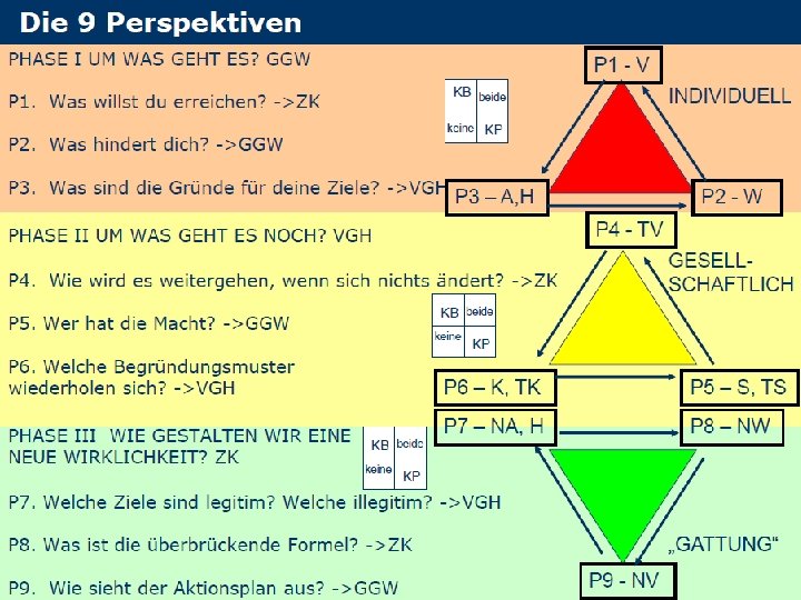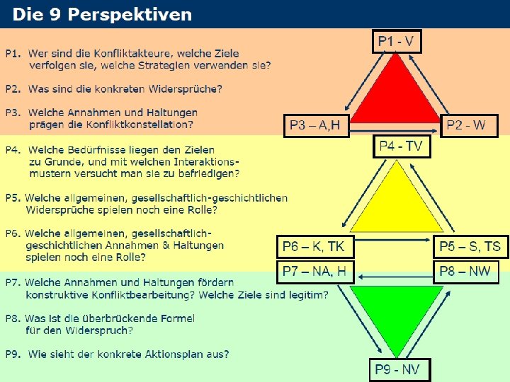 BEDEUTUNGEN INNENWELTEN BEZIEHUNGEN AUSSENWELTEN AKTEURE TRAUMAT A Gewalt / Gegengewalt VERHALTEN ANNAHMEN EMOTIONEN Polarisierung De-Humanisierung ZIELE WIDERSPRÜCHE KONFLIKTSYSTEM Ungelöste Widersprüche SOZIALES VERHALTEN (bewußt / unbewußt) KULTURELLE BEDEUTUNGEN explizite / implizite Kulturen GRUND BEDÜRFNISSE TRANSFORMIERTE ANNAHMEN & EMOTIONEN (Empathie) TRANSFORMIERTE ZIELE SOZIALE SYSTEME manifeste / latente Strukturen TRANSFORMIERTE WIDERSPRÜCHE (Kreativität) TRANSFORMIERTES VERHALTEN (Gewaltfreie Aktion und Kommunikation)