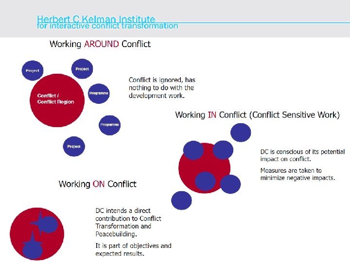 KONFLIKTSENSITIVE EZ 1992/93 Somalia Fiasko 1994 Ruanda Schock 1999 Do No Harm 2000 Working around/in/on Conflict 2007 Peace and Conflict Assessment (Mary B. Anderson and the Collaborative for Development Action, 1999) (Jonathan Goodhand the Conflict, Security And Development Group, 2000) (Thania Paffenholz / Reychler, Luc: Aid for Peace. A Guide to Planning and Evalauation for Conflict Zones, 2007)