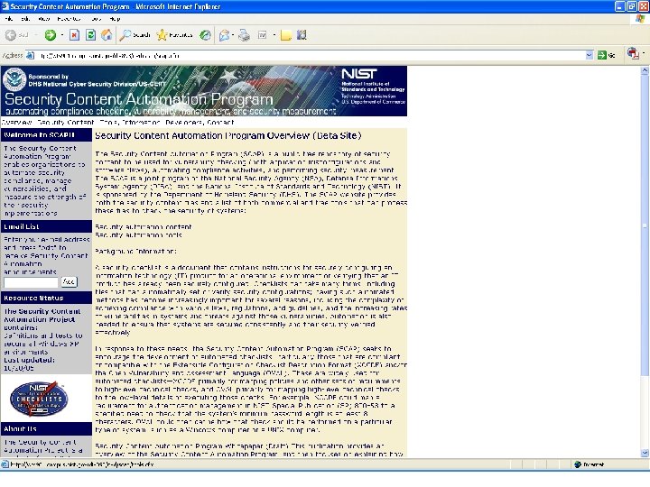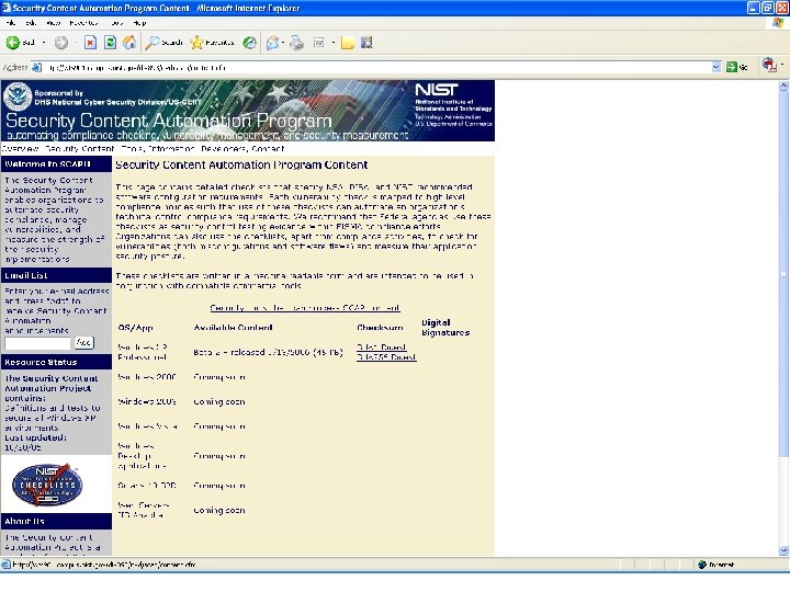 NIST Checklist Program § In response to NIST being named in the Cyber Security R&D Act of 2002. § Encourage Vendor Development and Maintenance of Security Guidance. § Currently Hosts 115 separate guidance documents for over 140 IT products. § In English Prose and automation-enabling formats (i. e. . inf files, scripts, etc. ) § Need to provide configuration data in standard, consumable format. § http: //checklists. nist. gov