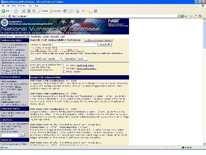 National Vulnerability Database § NVD is a comprehensive cyber security vulnerability database that: § Integrates all publicly available U. S. Government vulnerability resources § Provides references to industry resources. § It is based on and synchronized with the CVE vulnerability naming standard. § XML feed for all CVEs § http: //nvd. nist. gov