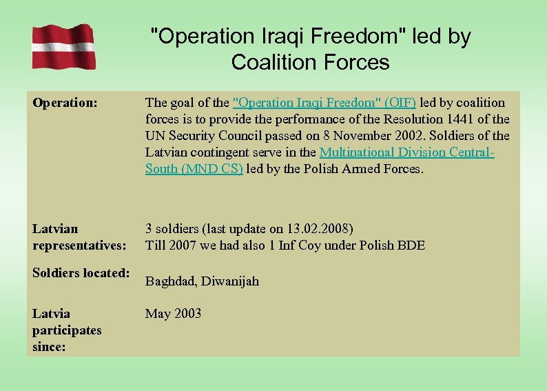 "Operation Iraqi Freedom" led by Coalition Forces Operation: The goal of the "Operation Iraqi Freedom" (OIF) led by coalition forces is to provide the performance of the Resolution 1441 of the UN Security Council passed on 8 November 2002. Soldiers of the Latvian contingent serve in the Multinational Division Central. South (MND CS) led by the Polish Armed Forces. Latvian representatives: 3 soldiers (last update on 13. 02. 2008) Till 2007 we had also 1 Inf Coy under Polish BDE Soldiers located: Baghdad, Diwanijah Latvia participates since: May 2003