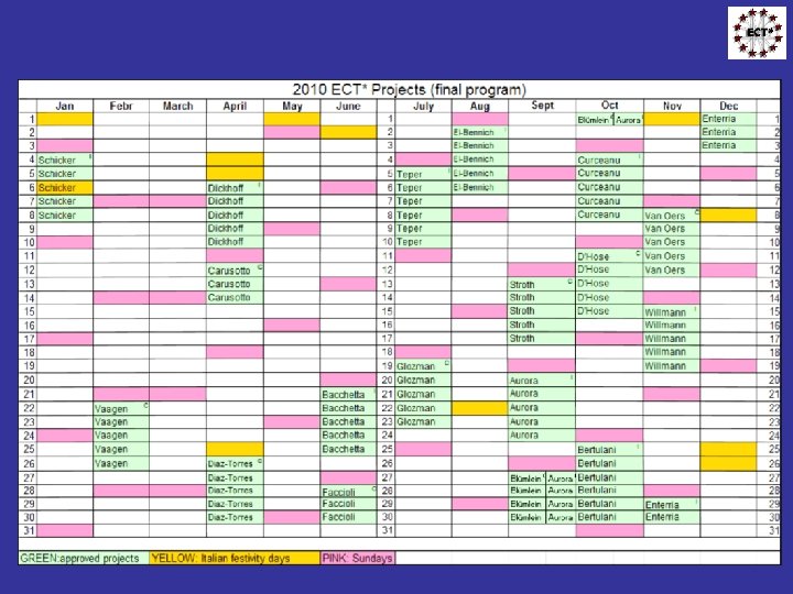 Visiting Scientists at the ECT* in 2010 § Until October 02, 9 short-term visitors at ECT*: Peter Levai (Hungary), Marco Grossi (INFN Parma), Jean-Paul Blaizot (France), Andrea Beraudo (INFN Torino), A. Sternbeck (Univ. Regensburg), A. Saltarelli (Univ. Camerino), S. Das Gupta (Univ. Camerino), L. Theussl (RCQI, Bratislava) and S. Karshenboim (MPQ Garching) § 533 scientists participated in the Workshop, DTP and Aurora. School programme so far and spent up to 14 days at ECT*. § Visitors (1 -6 weeks) in 2010: Mauricio Porto Pato (Brasil), Laura Muñoz (Spain), Victor Flambaum (Australia), Andrei Derevianko (USA), Avraham Gal (Israel), Vadim Lensky (UK), Andreas Schaefer (Germany) § Long term visitor: Georges Ripka (April 01 – June 30)