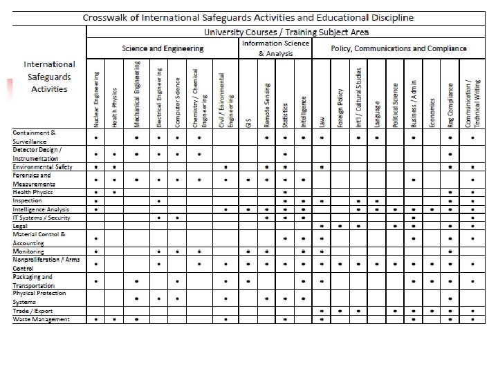 A Multidisciplinary Workshop to Train the Next Generation of Safeguards Advocate n University presentations n n n Science and Engineering Information Science and Analysis Policy, Communications and Compliance