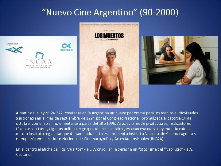 “Nuevo Cine Argentino” (90 -2000) A partir de la ley N° 24. 377, comienza en la Argentina un nuevo panorama para los medios audiovisuales. Sancionada en el mes de septiembre de 1994 por el Congreso Nacional, promulgada el catorce 14 de octubre, comenzó a implementarse a partir del año 1995. Asociaciones de productores, realizadores, técnicos y actores, algunos políticos y grupos de intelectuales gestaron esa nueva ley modificando al mismo Instituto regulador que denominado hasta ese momento Instituto Nacional de Cinematografía se reemplazó por el Instituto Nacional de Cinematografía y Artes Audiovisuales (INCAA) En el centro el afiche de “los Muertos” de L. Alonso, en la derecha un fotograma del “Oso Rojo” de A. Caetano