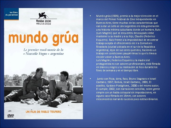 • Mundo grúa (1999), premio a la mejor dirección en el marco del Primer Festival de Cine Independiente en Buenos Aires, tiene muchas de las características que van a dar un sello al cine argentino de esta generación: una historia mínima suburbana donde un hombre, Rulo (Luís Magrini) que se encuentra desocupado debe mantener a su madre y a su hijo, Claudio (Federico Esquerro). Rulo frente a la imposibilidad de encontrar trabajo acepta el ofrecimiento de ir a Comodoro Rivadavia (ciudad ubicada en el sur de la República Argentina), lejos de sus seres queridos, haciendo un trabajo en condiciones paupérrimas lo que lo lleva a decidir volver a Buenos Aires. Luís Magrini, Federico Esquerro y la madre del protagonista no son actores profesionales, está filmada en blanco y negro y su realización se hizo durante los fines de semana y en el tiempo libre. • Junto con Pizza, birra, faso, Bruno Stagnaro e Israel Caetano, 1997; Bolivia, Israel Caetano, , 2001; El asadito, Gustavo Postiglione, , 2000 y del mismo autor, El cumple, 2002, son narraciones sencillas, sobre gente simple con un habla coloquial sin impostaciones, en alguno caso filmada en 16 mm, con actores desconocidos narrando sucesos poco extraordinarios.