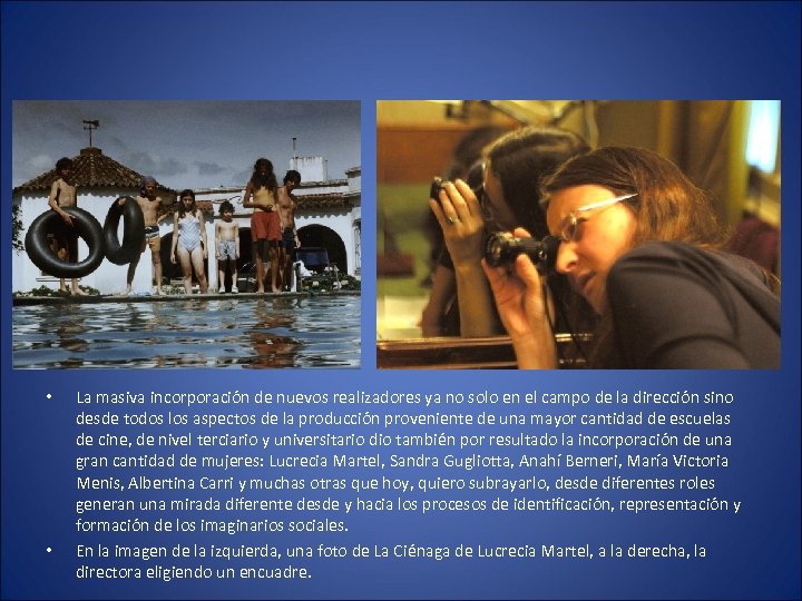 • • La masiva incorporación de nuevos realizadores ya no solo en el campo de la dirección sino desde todos los aspectos de la producción proveniente de una mayor cantidad de escuelas de cine, de nivel terciario y universitario dio también por resultado la incorporación de una gran cantidad de mujeres: Lucrecia Martel, Sandra Gugliotta, Anahí Berneri, María Victoria Menis, Albertina Carri y muchas otras que hoy, quiero subrayarlo, desde diferentes roles generan una mirada diferente desde y hacia los procesos de identificación, representación y formación de los imaginarios sociales. En la imagen de la izquierda, una foto de La Ciénaga de Lucrecia Martel, a la derecha, la directora eligiendo un encuadre.