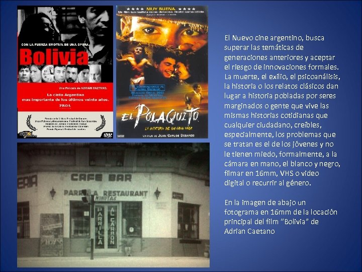 El Nuevo cine argentino, busca superar las temáticas de generaciones anteriores y aceptar el riesgo de innovaciones formales. La muerte, el exilio, el psicoanálisis, la historia o los relatos clásicos dan lugar a historia pobladas por seres marginados o gente que vive las mismas historias cotidianas que cualquier ciudadano, creíbles, especialmente, los problemas que se tratan es el de los jóvenes y no le tienen miedo, formalmente, a la cámara en mano, el blanco y negro, filmar en 16 mm, VHS o video digital o recurrir al género. En la imagen de abajo un fotograma en 16 mm de la locación principal del film “Bolivia” de Adrian Caetano