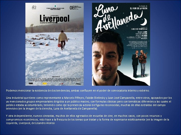 Podemos mencionar la existencia de dos tendencias, ambas confluyen en el poder de convocatoria interno y externo. Una industrial que tiene como representante a Marcelo Piñeyro, Fabián Bielinsky y Juan José Campanella, entre otros, apoyados por los ya mencionados grupos empresariales dirigidos a un público masivo, con formulas clásicas pero con temáticas diferentes a las cuales el público estaba acostumbrado, teniendo como eje la presencia actoral de figuras reconocidas, muchas de ellas extraídas del campo televisivo (en la imagen de la derecha, Luna de Avellaneda de Campanella). Y otra independiente, nuevos cineastas, muchos de ellos egresados de escuelas de cine, en muchos casos, con pocos recursos y compromisos económicos, esto hace a la frescura de los temas que tratan y la forma de expresarse estéticamente (en la imagen de la izquierda, Liverpool, de Lisandro Alonso