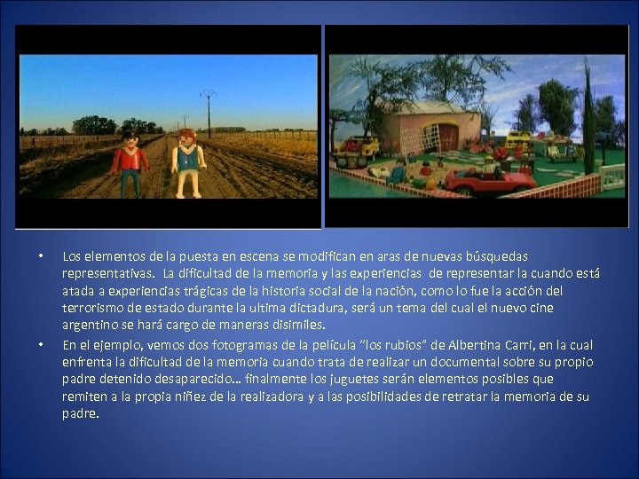 • • Los elementos de la puesta en escena se modifican en aras de nuevas búsquedas representativas. La dificultad de la memoria y las experiencias de representar la cuando está atada a experiencias trágicas de la historia social de la nación, como lo fue la acción del terrorismo de estado durante la ultima dictadura, será un tema del cual el nuevo cine argentino se hará cargo de maneras disimiles. En el ejemplo, vemos dos fotogramas de la película “los rubios” de Albertina Carri, en la cual enfrenta la dificultad de la memoria cuando trata de realizar un documental sobre su propio padre detenido desaparecido… finalmente los juguetes serán elementos posibles que remiten a la propia niñez de la realizadora y a las posibilidades de retratar la memoria de su padre.