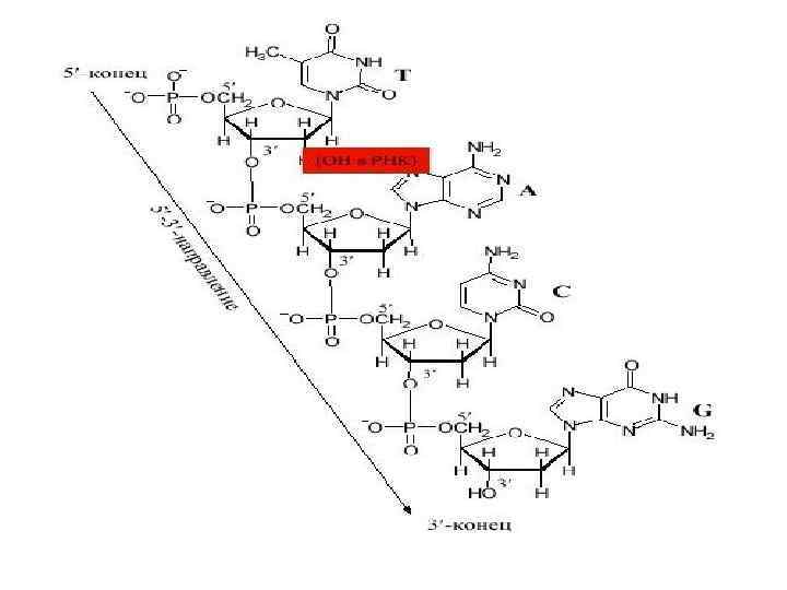 • На одном конце полинуклеотидной цепи находится свободная фосфатная группа при 5/ атоме дезоксирибофу-ранозы, на другом – дезоксирибофура-ноза со свободным гидроксилом у 3/ атома. • Так что принято говорить о 5/- и 3/-концах молекулы, причем 5/-конец считается началом цепочки ДНК или РНК, а 3/- окончание полинуклеотидной цепи.