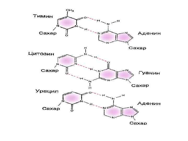 Вторичная структура нуклеиновых кислот Образование водородных связей между парами нуклеиновых оснований (комплементарные пары оснований) тимин-аденин, цитозин-гуанин