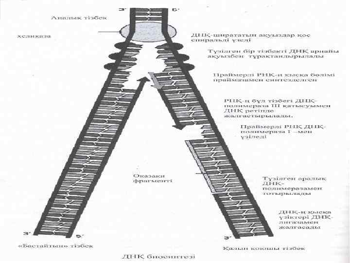 Репликация механизмі. Ажыратушы ақуыз әсерінен матрицалық ДНҚ-ның жұп спираліндегі негіздер арасындағы сутектік байланыстар үзіледі. Праймерлер синтезделген сайын РНҚполимераза ДНҚ-дан босап отырады. Ары қарай праймерге ДНҚ-полимераза 3 -тың көмегімен сәйкес ДНҚ-лар 5 -3 бағытында бірбіріне қосылады. Қорытындысында матрицалық ДНҚ-ның бір полинуклеотидтік тізбегнің бойында үзіліссіз РНҚ-ДНҚ гибридтік тізбегі синтезделеді.