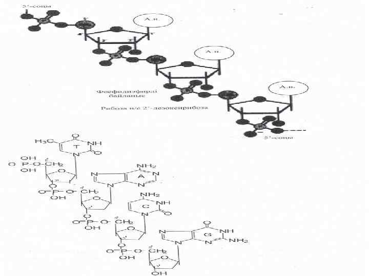 Нуклеин қышқылдары-биополпимерлер, олардың мономерлері-ДНҚ және РНҚ нуклеотидтері. Нуклеотидтерден өте ұзын молекулаларполинуклеотидтер құралады. Сәйкес кеңістіктік конфигурацияға келген полинуклеотидтік тізбектер ДНҚ немесе РНҚ құрылымын қалыптастырады. ДНҚ молекуласының полинуклеотидтік тізбегі өзінің құрылымында дезоксирибозасы бар нуклеотидтерден тұрады: d-АМФ, d-ТМФ, d-ЦТФ, d-ТМФ. РНҚ -ның полинуклеотидтік тізбегі құрамында рибоза бар нуклеотидтерден тұрады-АМФ, ГМФ, ЦМФ, УМФ.
