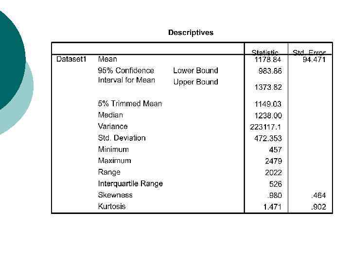 Using a computer ¡ ¡ In SPSS/PASW, use Analyse > Descriptive Statistics > Explore to produce a variety of numerical statistics describing the data set In Excel, use Tools > Data Analysis > Descriptive Statistics