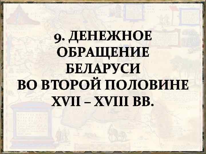 Периодизация денежного обращения (по типам денежных систем) 1. 2. 3. 4. 5. 6. 7. 8. 9. 10. древнерусский период (IX – середина XIII в. ); период куфического дирхема (IX – X вв. ); период западноевропейского динария (конец X – начало XII вв. ); первый этап “безмонетного” периода (нач. XII – сер. XIII вв. ); второй этап “безмонетного” периода (сер. XIII в. – нач. XIV в. ), включает также начальный этап региональных денежных систем (вт. четв. XIII – нач. XIV вв. ); период пражского гроша (нач. XIV в. – 1492 г. ), включает последний этап региональных денежных систем (1300 – 1305 – 1394) и период ранней общегосударственной денежной системы ВКЛ (1394 – 1492 гг. ); период с 1492 – по 1569 гг. ; период РП (1569 – 1795 гг. ); период Российской империи (1795 – 1917 гг. ); советский период (1917 – 1991 гг. ); 1992 г. – с объявления суверенитета Беларуси 10