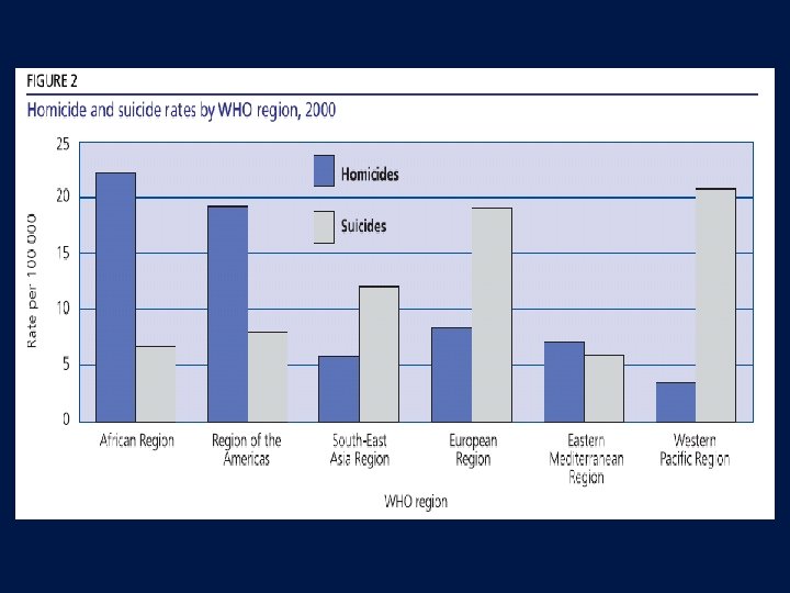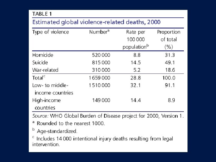 Violence • Each year, more than 1. 6 million people worldwide lose their lives to violence • Violence is among the leading causes of death for people aged 15– 44 years worldwide, accounting for about 14% of deaths among males and 7% of deaths among females • Of the 1. 6 million violence-related deaths worldwide (including those from conflict and suicide) that occur each year, 90% happen in low- and middle-income countries