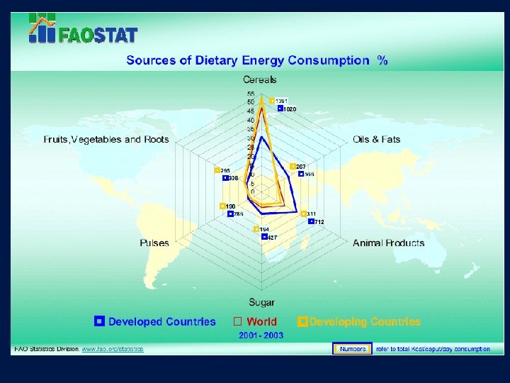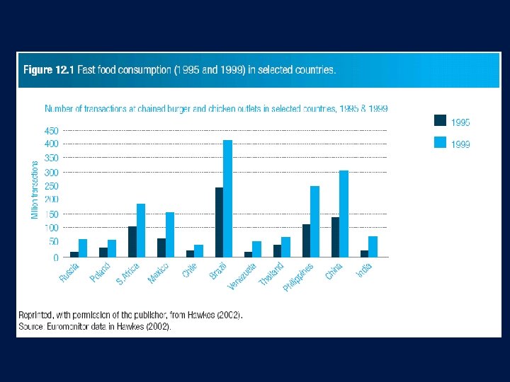 Shifts in Diets • increases in the consumption of foods sourced from animals, caloric sweeteners and fat • Between 1970 and 1995 the world consumption of calories from starchy roots and pulses fell by 30% while the proportion of calories from meat increased by a third and from vegetable oils by almost half • Over the same period the consumption of meat and poultry doubled in Asian countries while the consumption of vegetables halved