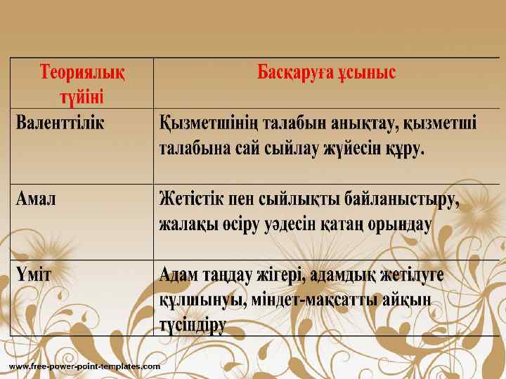• Аталған теория бойынша қызметші белсенділігін көтерудің үш шарты бар: 1. Валенттілік(Valence):Сыйлау және жеке қажеттерін қанағаттандыру 2. Амал(Instrumentality):Жетістік пен сыйлықтың байланысы 3. Үміт(Expectancy):Жетістік пен талпыныстың байланысы • Мотивация деңгейі осы үшеуінің көбейтіндісіне тең: F = E*( Σ V*I )