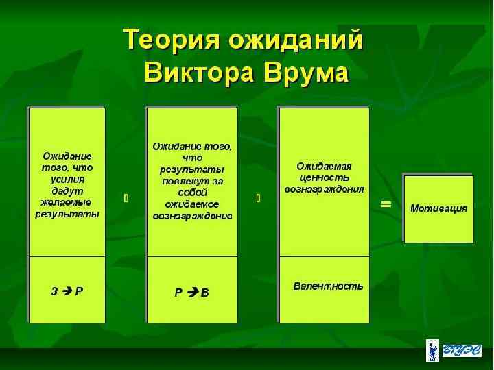 В. Врум өзінің теориясында адамды энергетикалық шығындарды шектеу арқылы максимальды пайда алуға ұмтылатын жаратылыс ретінде қарастырады. Күту теориясының негізі болып табылады: Тапсырманы орындауға адамның белгелі бір күш жұмсау мотвациясы күтуге байланысты