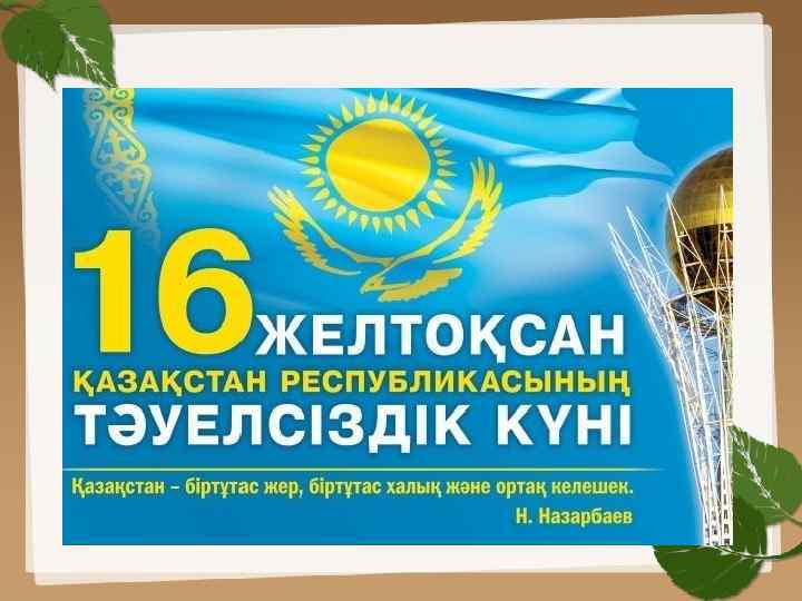 ü Тәуелсіздік – ұлттық тілдің, дәстүрдің, салт - сананың мызғымас тірегі, күші, алтын діңгегі, халықтың бақ жұлдызы. Тәуелсіздік – арман! Жер бетінде қанша ұлт болса, сонша арман бар. Сол арманға біздің қазақ халқы жетті. ü 16 желтоқсан – ата бабамыздың арманы орындалып, жасампаздығымызды жаңа белеске көтерген Тәуелсіздік күні. 1991 жылғы 16 желтоқсанда Президент Нұрсұлтан Назарбаев қол қойған Конституциялық Заңнан бастау алған тәуелсіздігімізге 25 жыл толды.