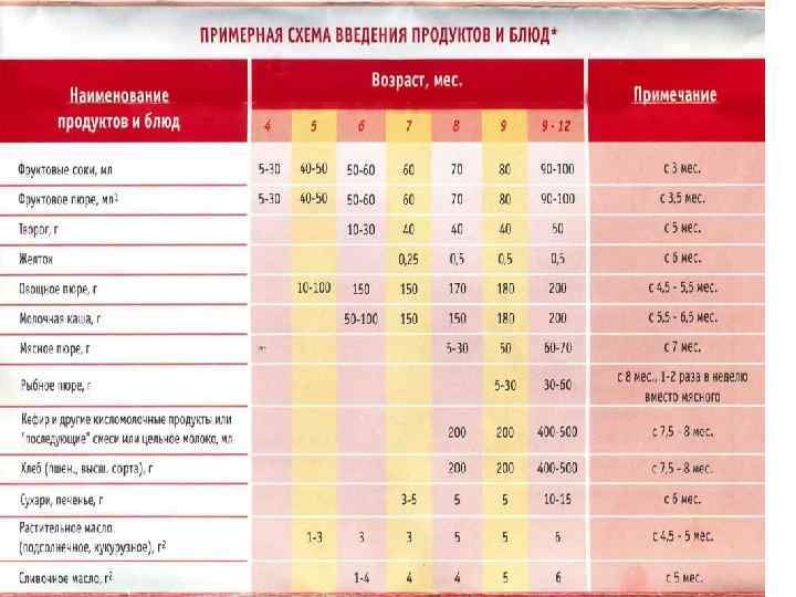 5 айлық балаға 4 рет емшек еміл, 1 рет көкөніс пюресін және бұдан басқа әр түрлі шырын мен балық майын береді. 5— 5, 5 айлық бала тағамының рационына 5 проценттік манный ботқасы (100 г. сұйыққа 1 ас қасық жарма қосады) мен кисель қосуға болады. 5, 5— 6 айлық балаға 10 проценттік манный ботқасын, әр түрлі көкөніс пюресін (картоп, сәбіз, капуста, аралас пюрелер) береді, алғашқы кезде 2 — 3 қасықтай беріп, кейін 150 грамға дейін жеткізеді. 6— 7 айлығында ет сорпасьш, пісірілген жұмыртқаның сары уызын; 7— 8 айлық балаға — қытырлақ нан, печенье; 7, 5— 8 айлығында ет фаршын береді.