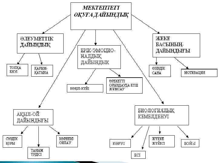Баланы мектепке дайындау Мектепке дейінгі баланың өмірінде әлеуметтік, психологиялық жағынан және физиологиялық жағынан да қиын кезең. Бұл кезеңде мектеп өмірімен танысады, әлеуметтік ортасы өзгеріп және оқушының жаңа әлеуметтік рөлін меңгере бастайды.