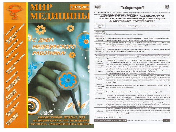 УЧЕБНАЯ ЛИТЕРАТУРА, СПОСОБСТВУЮЩАЯ РЕАЛИЗАЦИИ ОБСУЖДАЕМОЙ ПРОГРАММЫ ОБУЧЕНИЯ Другие руководства и периодические издания по лабораторной медицине, и прежде всего журналы: ▪ «Мир медицины» ▪ «Медицинские знания»
