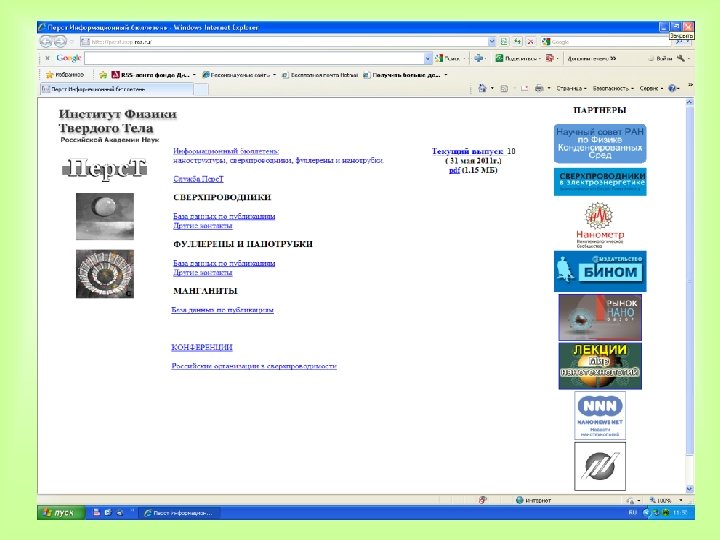 Система Перс. Т создана с целью оперативного доведения до пользователя актуальной информации по вопросам физики сверхпроводников, фуллеренов, нанотрубок, наноэлектроники, наноматериалов, графена, магнитным системам, передачи информации на квантовом уровне и другим направлениями науки Перс. Т http: //perst. issp. ras. ru Базы данных: Сверхпроводники Фуллерены Манганиты Экспресс-бюллетель «Перс. Т» (Перспективные Технологии: сверхпроводники, фуллерены, наноструктуры)