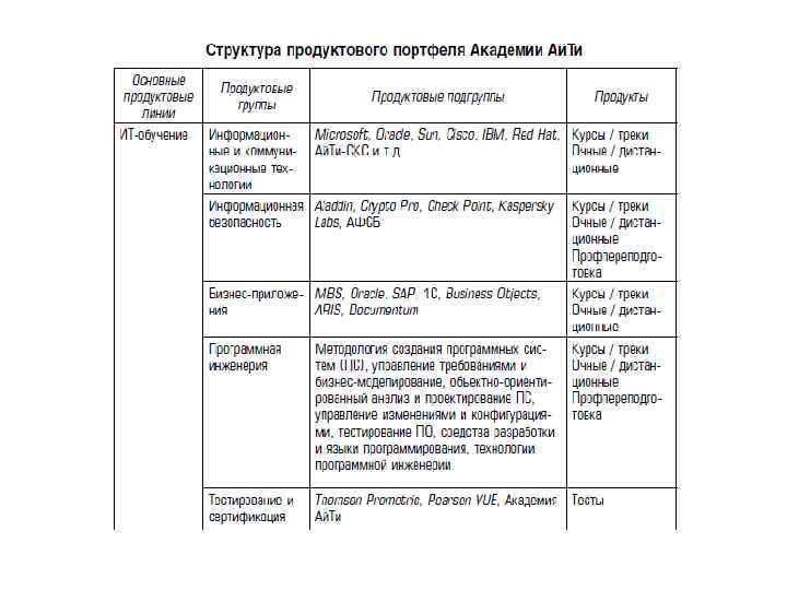 Академия Ай. Ти была образована в 1995 г. в качестве учебного центра ЗАО «Компания Ай. Ти. Информационные технологии» — ведущего рос-сийского системного интегратора. Основное направление бизнеса в тотпериод — авторизованное обучение технологиям Microsoft, Novell, SCO. На первом этапе развития Академии Ай. Ти (1995– 2005 гг. ) основная стратегия состояла в позиционировании на рынке и наращивании компетенций в области авторизованного обучения информационным технологиям в формате краткосрочных курсов и тренингов.