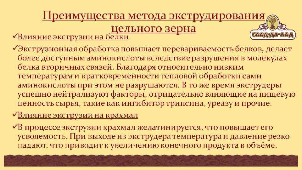 Современные технологии переработки цельно зерновых продуктов Экструзия-очень кратковременный нагрев-всего 3 секунды, давление, взрыв целлюлозных оболочек-100% биоусваиваемость. 1 куб. м зерна = 15 куб. м воздушных зерен