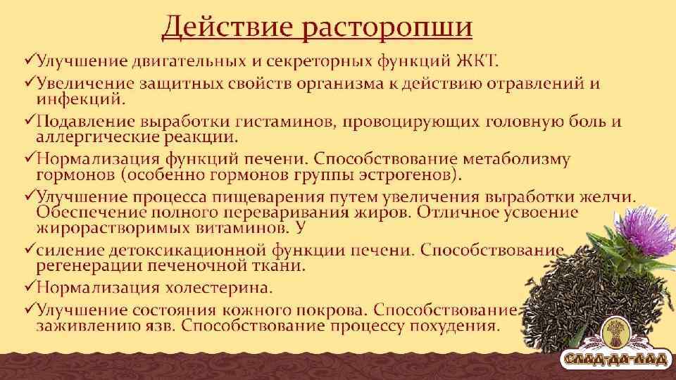Фитокомпоненты входящие в состав воздушных зерен. Расторопша пятнистая это источник силимарина-природного флаволигнана, обладающего мощным гепатопротекторным свойством. Легко соединяется с токсичными веществами и оксидами. Одна молекула силимарина способна нейтрализовать 50 молекул ртути. Силимарин лучший друг печени предотвращающий жировой гепатоз и восстанавливающий ее функции.