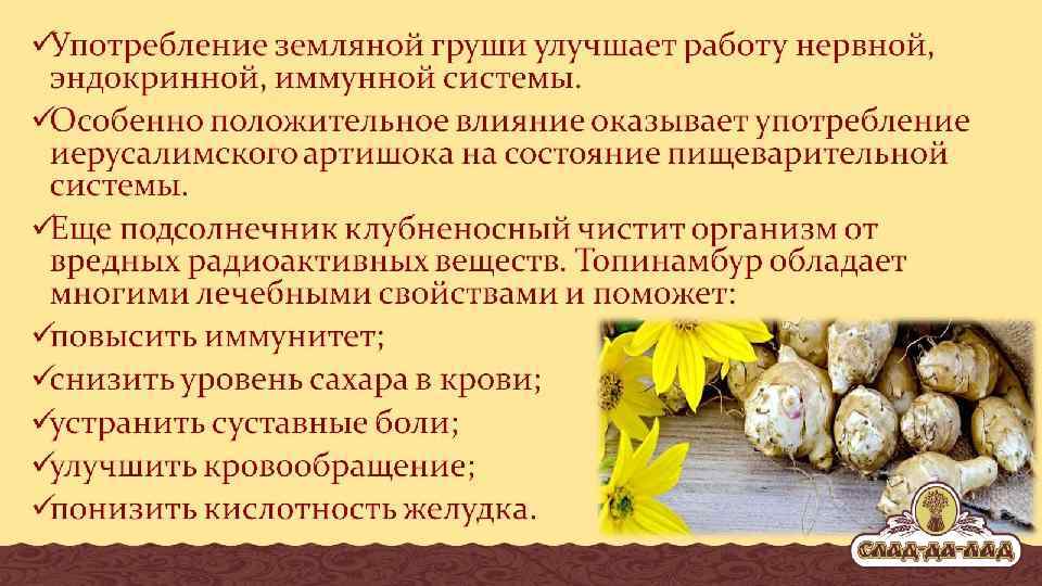 Фито компонент - топинамбур Источник инулина – лучшего друга для поджелудочной железы и микрофлоры кишечника, способствующий выработке инсулина и нормализации уровня сахара в крови.