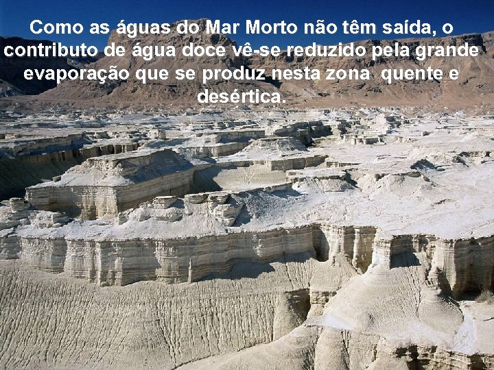 Como as águas do Mar Morto não têm saída, o contributo de água doce vê-se reduzido pela grande evaporação que se produz nesta zona quente e desértica.