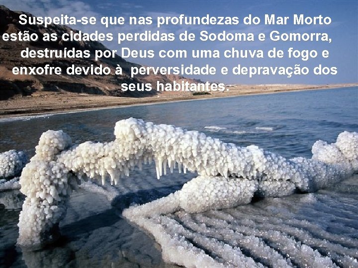 Suspeita-se que nas profundezas do Mar Morto estão as cidades perdidas de Sodoma e Gomorra, destruídas por Deus com uma chuva de fogo e enxofre devido à perversidade e depravação dos seus habitantes.