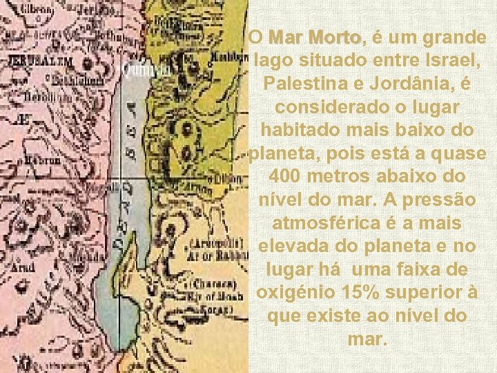 O Mar Morto, é um grande lago situado entre Israel, Palestina e Jordânia, é considerado o lugar habitado mais baixo do planeta, pois está a quase 400 metros abaixo do nível do mar. A pressão atmosférica é a mais elevada do planeta e no lugar há uma faixa de oxigénio 15% superior à que existe ao nível do mar.