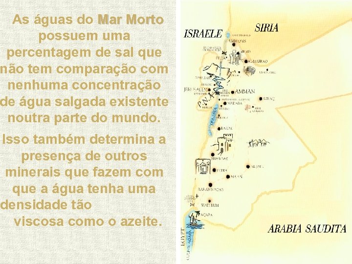 As águas do Mar Morto possuem uma percentagem de sal que não tem comparação com nenhuma concentração de água salgada existente noutra parte do mundo. Isso também determina a presença de outros minerais que fazem com que a água tenha uma densidade tão viscosa como o azeite.