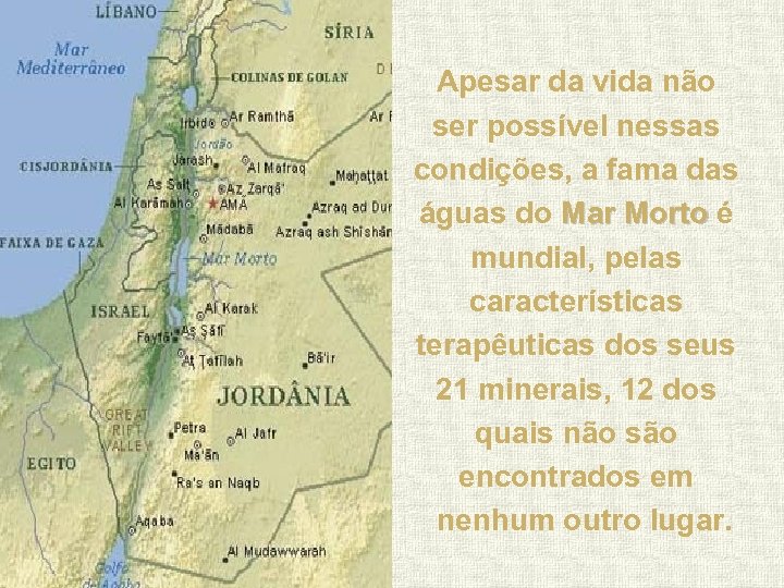 Apesar da vida não ser possível nessas condições, a fama das águas do Mar Morto é mundial, pelas características terapêuticas dos seus 21 minerais, 12 dos quais não são encontrados em nenhum outro lugar.