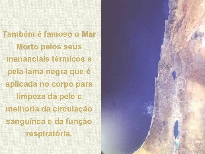 Também é famoso o Mar Morto pelos seus mananciais térmicos e pela lama negra que é aplicada no corpo para limpeza da pele e melhoria da circulação sanguínea e da função respiratória.