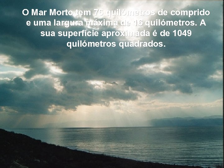O Mar Morto tem 76 quilómetros de comprido e uma largura máxima de 16 quilómetros. A sua superfície aproximada é de 1049 quilómetros quadrados.